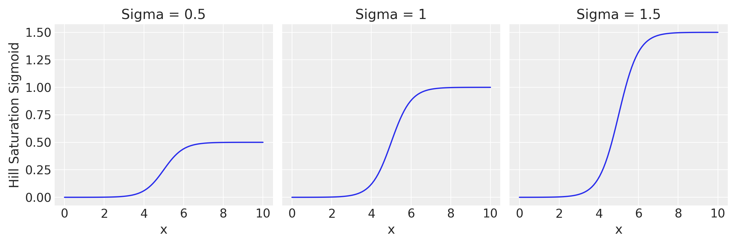 This function computes the Hill sigmoidal response curve, which is commonly used to describe the saturation effect in biological systems. The curve is characterized by its sigmoidal shape, representing a gradual transition from a low, nearly zero level to a high plateau, the maximum value the function will approach as the independent variable grows large. In this implementation, we add an offset to the sigmoid function to ensure that the function always passes through the origin as we expect zero spend to result in zero contribution.