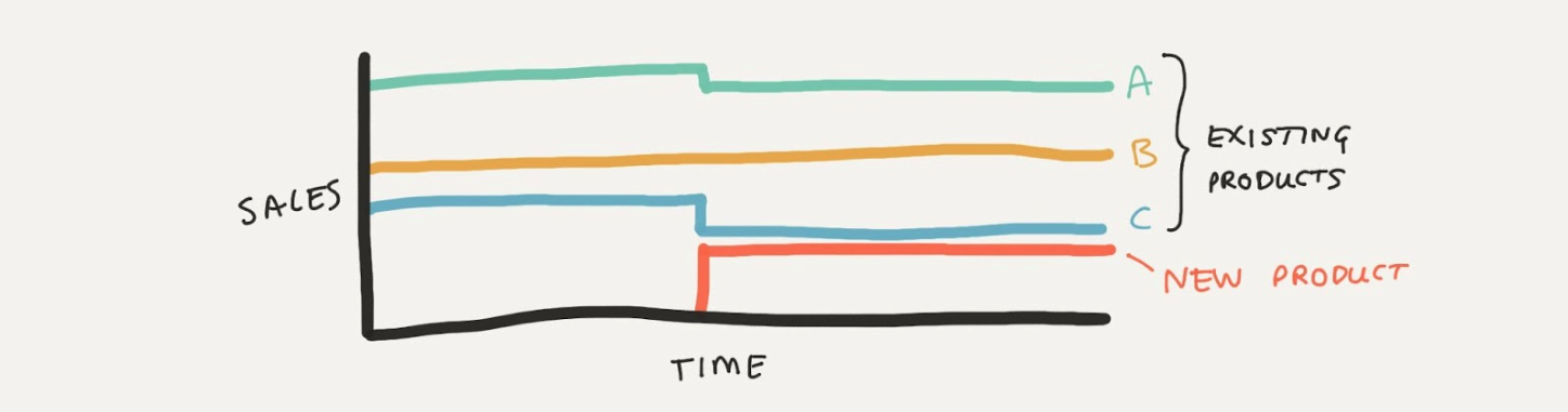 In the plot below we have a period of time before we release a new product. We can see that sales of products A, B, and C are stable (yes this is a simplification!). But half way through our time period we release a new product and we can see that it sells reasonable volumes. The question is, where are these sales coming from?
