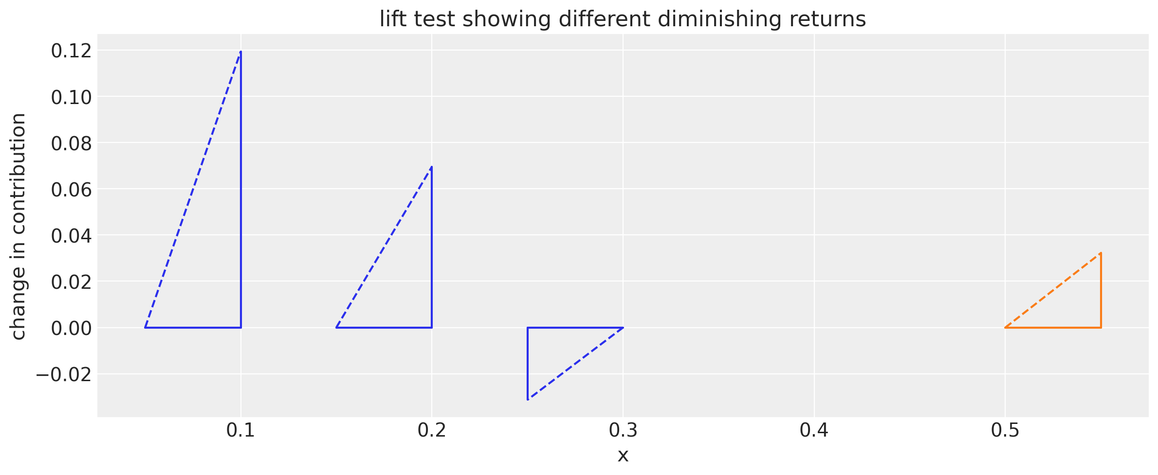 An experiment characterized in this way can be viewed as two points on the saturation curve for the channel. Accordingly, lift test calibration is implemented by adding a term to the model likelihood, that makes the channel saturation curve (the contribution as a function of spend) align with the test observation.