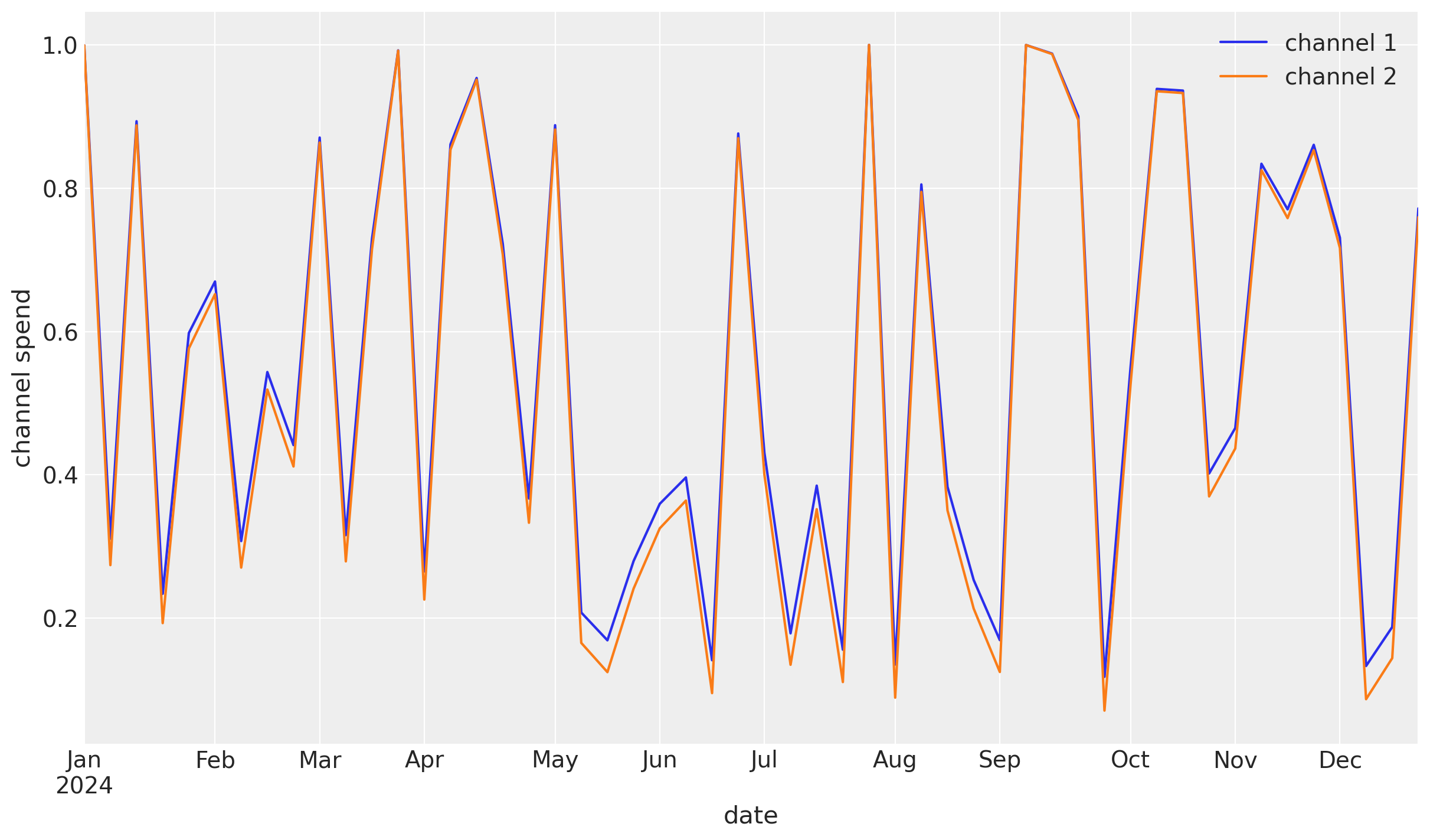 data=df[["date", "channel 1", "channel 2"]],