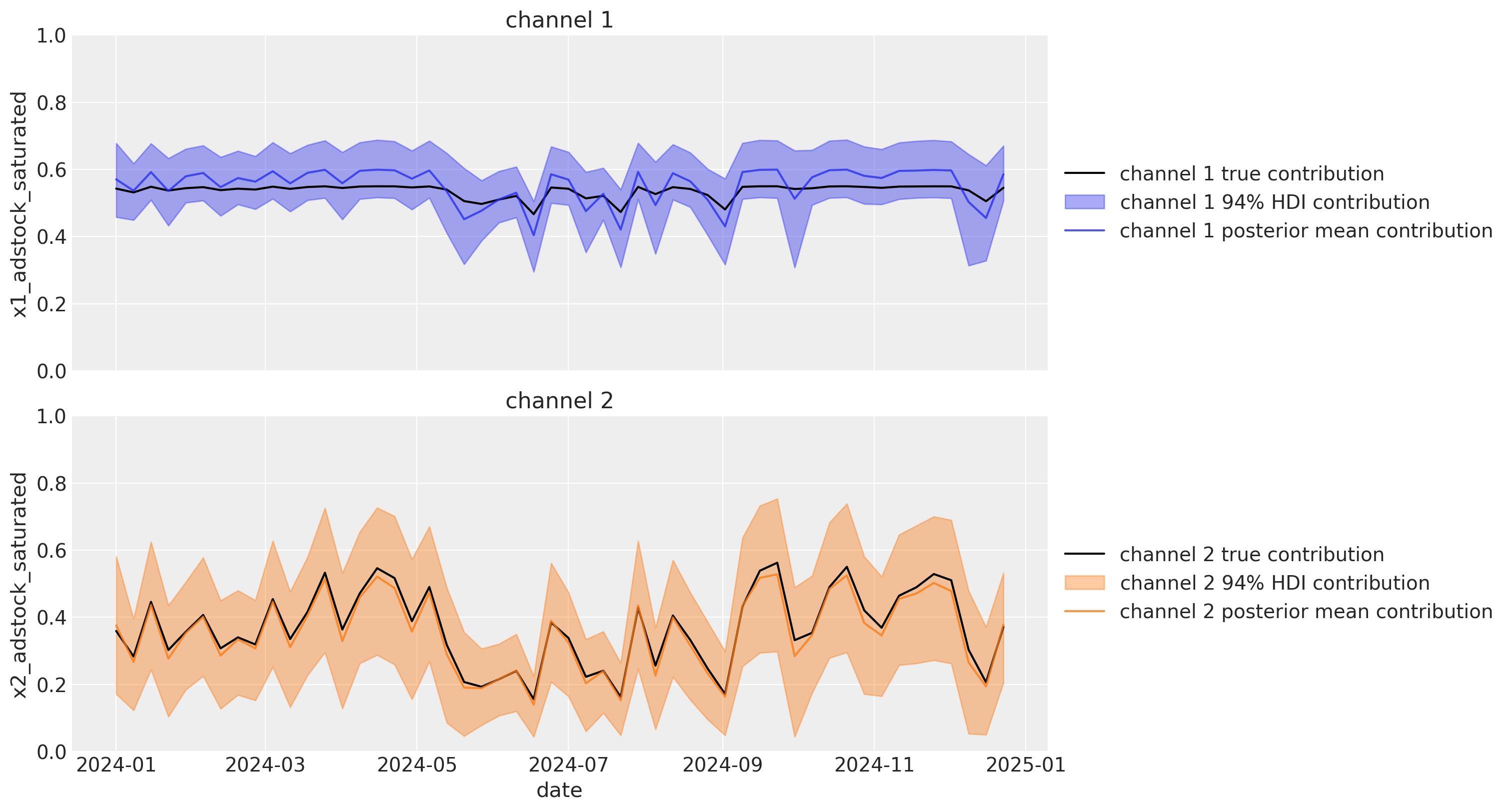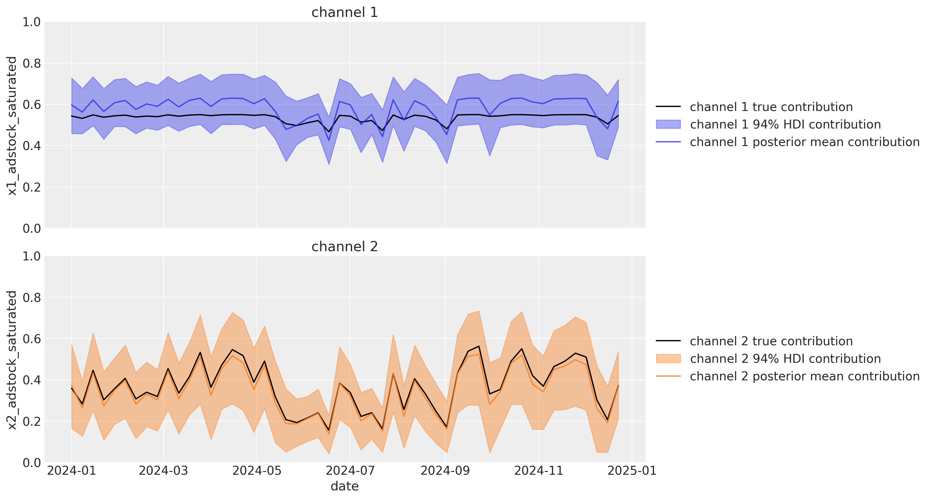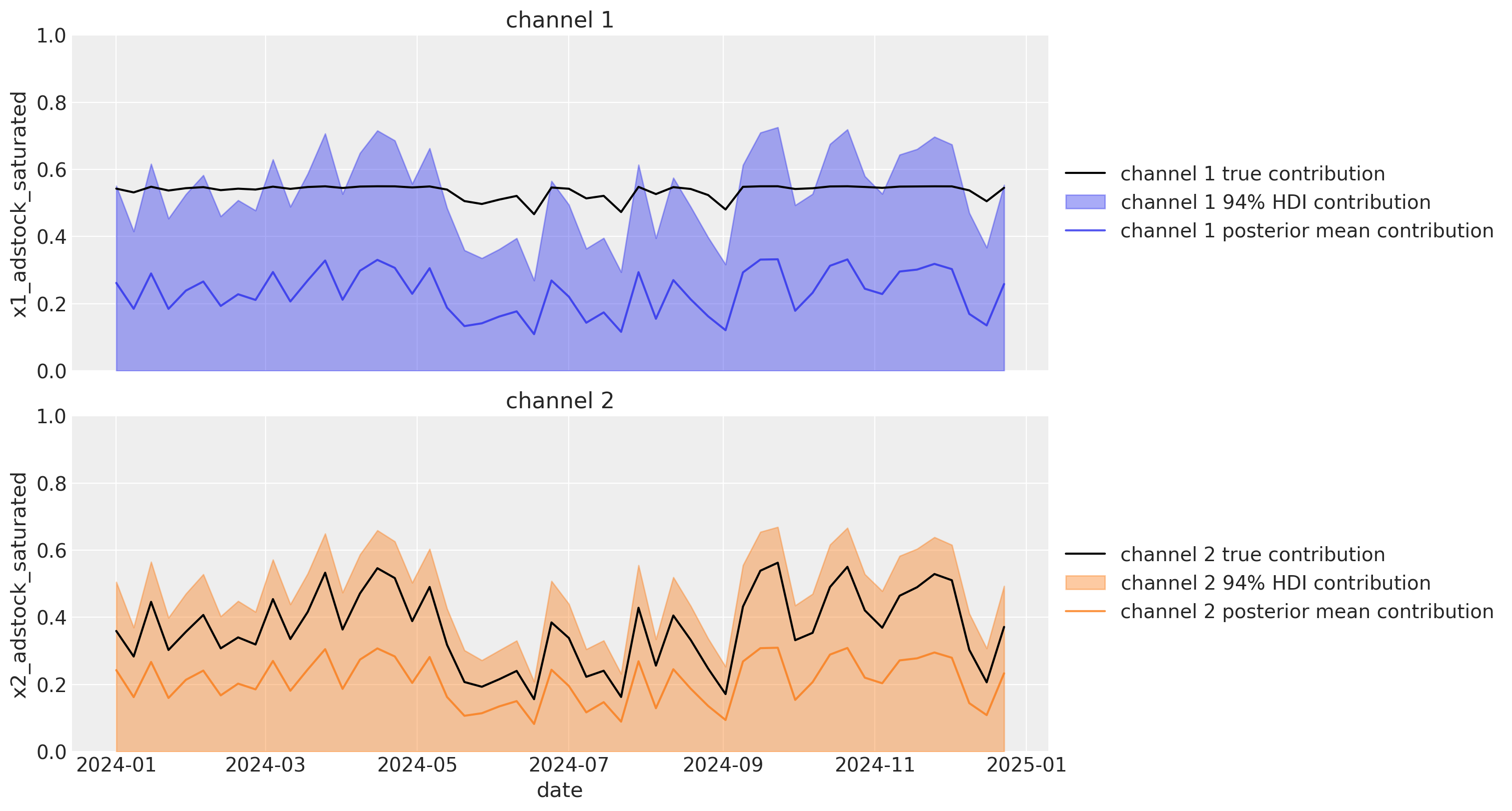 We can also visualize the channel contributions over time. The wide HDI’s in the plot below shows that we have considerable uncertainty in the channel contributions. We can also see that the posterior means of the channel contributions are quite far off the mark of the actual channel contributions. Again, these true channel contributions are only known to us in this synthetic data example and would not be available to us in a real world scenario.