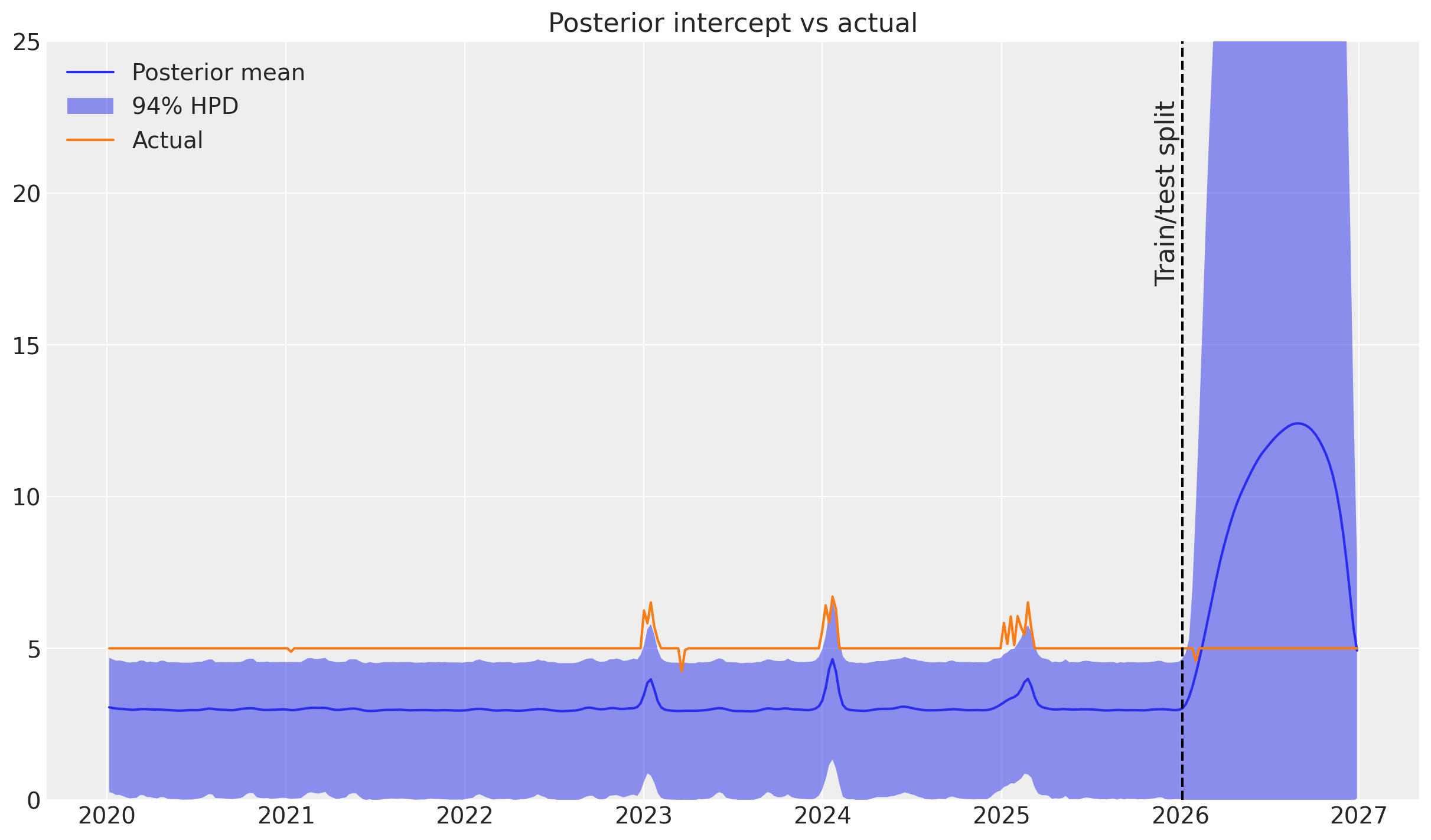 This is a strong indication that the time-varying intercept prior may not be well parameterized. Since the events that we synthesize happen on shorter time scales than the trends we modeled previously, it is likely that the mean of the length-scale prior is too high (default is two years).